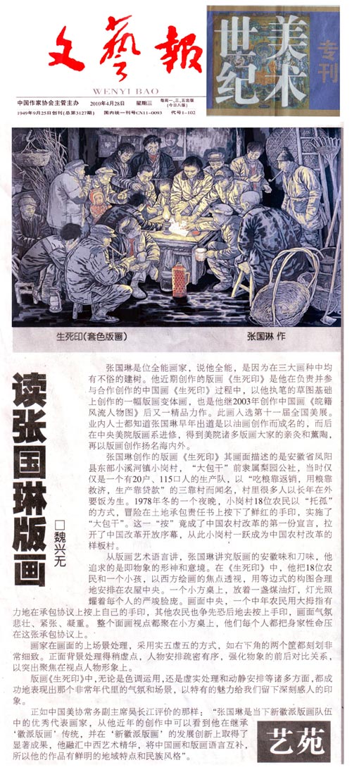 2010年4月28日發(fā)表于文藝報(讀張國琳版畫(huà))畫(huà)評文章