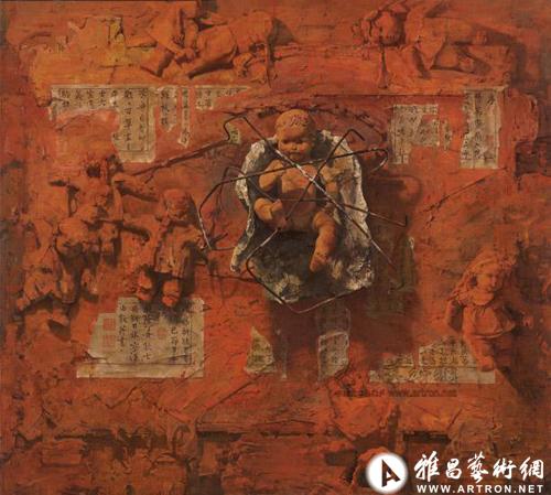 “還有幾件作品就是我比較早期的那些,應該講是我比較年輕的時(shí)候,還處在“85運動(dòng)”時(shí)期狀態(tài)下面,對觀(guān)念藝術(shù)特別迷戀的那個(gè)時(shí)候的幾張靜物,比如說(shuō)《天惶惶地惶惶》,《對白》等作品,可以看出是在寫(xiě)實(shí)繪畫(huà)中盡量的把觀(guān)念的東西引入到里邊去的繪畫(huà)。這幾張畫(huà),是當時(shí)我畫(huà)得比較典型的幾張,其中有一張《天惶惶地惶惶》是沈桂林先生這一次從保利拍賣(mài)公司拍下來(lái)的,這張畫(huà)很早以前很便宜地賣(mài)出去了,賣(mài)給了一個(gè)臺灣人,那臺灣人又返回了中國,今年春拍沈桂林先生從保利拍回來(lái),花了300萬(wàn),這張作品是有故事的。的確觀(guān)念這個(gè)東西我是這樣認為,它有一種引導性,有效性,它具有一種運動(dòng)性和如何同國際鏈接的功能在里頭,他有這種大的概念在里頭,同時(shí)觀(guān)念藝術(shù)要把觀(guān)念引入到繪畫(huà)里邊,自然地引入到繪畫(huà)里邊去,成為你繪畫(huà)中一個(gè)重要的亮點(diǎn),必須發(fā)自于內心一種深刻的理解和一種感覺(jué)上的沖動(dòng),我是這樣認為,這種觀(guān)念的引入具有合理性,甚至還有共鳴的意義在里頭。這張繪畫(huà)叫《天惶惶地惶惶》,畫(huà)的是一張紅色的作品,上面有很多玩偶,當中有一個(gè)玩偶被禁錮,被鐵條禁錮在一個(gè)石膏做的襁褓里頭,是什么意義呢?我為什么要回憶呢?因為這個(gè)繪畫(huà)到現在快二十年了,那個(gè)時(shí)候我的女兒一天到晚生病,我是經(jīng)常半夜起來(lái)把她送到醫院去,因此我內心充滿(mǎn)著(zhù)一種糾結甚至恐怖,我只要聽(tīng)到我女兒咳嗽一下我就想完了,后面的事情就來(lái)了,只要她咳嗽一下,流點(diǎn)兒清鼻涕,馬上接著(zhù)就不可收拾,非要到醫院就吊一個(gè)禮拜針或者住院,最后才慢慢好起來(lái),因為我那一段時(shí)間內心是煎熬的,因此我把這種情感,這種煎熬和糾結,恐怖的心境,主要是用這個(gè)東西寄托,把它發(fā)泄出來(lái)、抒發(fā)出來(lái),我選擇這樣的題材?!疤旎袒?,地惶惶”是我們民間里的一個(gè)符咒,你們可能不知道,過(guò)去我們小時(shí)候在大街小巷墻頭上面,公共設施上面,電線(xiàn)桿上面經(jīng)??梢钥吹竭@種符咒,上面寫(xiě)的是什么?就是“天惶惶,地惶惶,我家有個(gè)夜哭郎,過(guò)路的君子念一遍,一覺(jué)睡到大天光”。它是這么一個(gè)符咒,什么意思呢?天惶惶地惶惶這是一個(gè)說(shuō)法,就像念咒語(yǔ)一樣的,我家有個(gè)夜哭郎,孩子病了,在家里通宵達旦哭,怎么辦?靠所有的人幫我把這個(gè)病給驅逐出去,于是我貼了符咒,過(guò)路的君子看到這個(gè)要念一遍,小孩病就好了,就一覺(jué)睡到大天光,是這么一個(gè)意思。于是你可以看到我的畫(huà)面上小孩禁錮,紅色的,首先你不看它什么意思,從畫(huà)面反映出來(lái)的感覺(jué),這種畫(huà)是不安的。害怕、不安、上邊有一些紙的殘片,殘片是什么呢?你可以看到雍正時(shí)候的中藥方子,藥同這些墜落的孩子、嬰兒、玩偶放在一起,產(chǎn)生不安的情緒,一眼可以識別出來(lái)這是一種對病態(tài)的恐怖,我起的名字叫《天惶惶地惶惶》。這張畫(huà)是有故事的,故事就是來(lái)自于這個(gè),因此畫(huà)了這張畫(huà),我很喜歡這張畫(huà),我覺(jué)得這張畫(huà)保佑著(zhù)我的女兒,我女兒長(cháng)大了,病好了,現在一個(gè)亭亭玉立的女孩,身體很健康。這張畫(huà)現在又回到我的朋友這里我很高興,于是拿到這里作為主要作品進(jìn)行展示?!?/P>