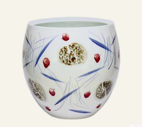 白明的陶瓷裝飾介乎抽象與具象之間,裝飾題材都是很普遍的物體,但是以完全不同的角度進(jìn)行表現,給人不同的美感,他并非完全將抽象的水墨作品“移植”到陶瓷上,而是契合陶瓷的形體,讓其變得柔美,瀟灑、自由、隨意結構的線(xiàn)表現萱草、嫩芽、枝蔓、荷塘,這是他特有的裝飾語(yǔ)言。