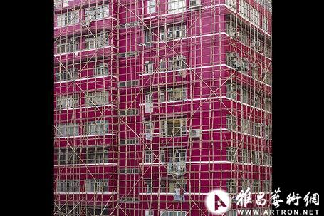 在香港,被竹制腳手架和彩色尼龍布圍起來(lái)的高樓到處都是,這樣的外觀(guān)標志著(zhù)建筑正經(jīng)歷修建、翻新、或者拆除的過(guò)程!独O》系列的攝影師彼得?施泰因豪爾(Peter Steinhauer)說(shuō):“這和我家鄉的情況恰好相反”。在他位于美國科羅拉多州博爾德(Boulder)的家鄉,“我們用鋼梁做這樣的事情。我知道我應該回來(lái)拍攝(香港的情形),這太特別了!