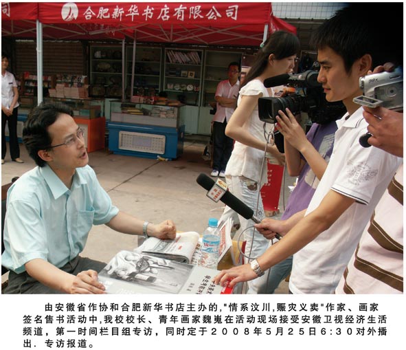 北京魏嵬藝術(shù)基地校長(cháng)、合肥廬上書(shū)畫(huà)院美術(shù)學(xué)校長(cháng)、知名青年畫(huà)家魏嵬受邀參加這次義賣(mài)活動(dòng)。魏嵬作為這次活動(dòng)唯一接受邀請的畫(huà)家受到媒體的廣泛關(guān)注。安徽衛視、經(jīng)濟生活頻道第一時(shí)間、合肥電視臺經(jīng)濟生活頻道均在5月25日晚上6:30播出專(zhuān)訪(fǎng)。同時(shí)這次藝賣(mài)活動(dòng)中,魏嵬把著(zhù)述的中央美院考前沖刺作業(yè),全套4冊,計50套美術(shù)高考教學(xué)用書(shū)所售款全部捐獻給四川災區。