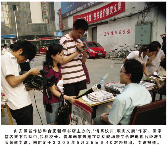 北京魏嵬藝術(shù)基地校長(cháng)、合肥廬上書(shū)畫(huà)院美術(shù)學(xué)校長(cháng)、知名青年畫(huà)家魏嵬受邀參加這次義賣(mài)活動(dòng)。魏嵬作為這次活動(dòng)唯一接受邀請的畫(huà)家受到媒體的廣泛關(guān)注。安徽衛視、經(jīng)濟生活頻道第一時(shí)間、合肥電視臺經(jīng)濟生活頻道均在5月25日晚上6:30播出專(zhuān)訪(fǎng)。同時(shí)這次藝賣(mài)活動(dòng)中,魏嵬把著(zhù)述的中央美院考前沖刺作業(yè),全套4冊,計50套美術(shù)高考教學(xué)用書(shū)所售款全部捐獻給四川災區。