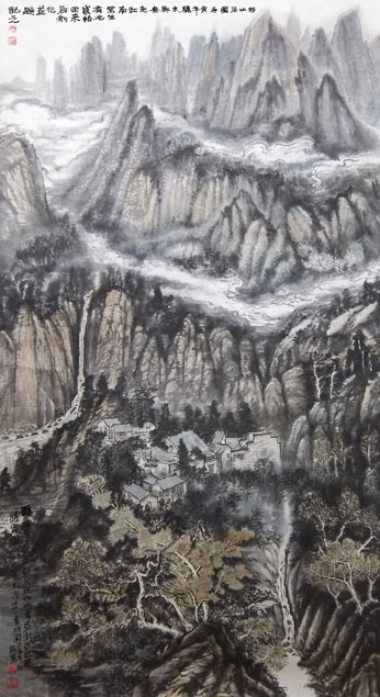 《黟山居圖》是他去年黃山寫(xiě)生后創(chuàng )作的作品,《黟山居圖》六尺豎式構圖,紙本設色。此圖描繪了黟山農居的場(chǎng)景,黃山舊名黟山。我們可以從兩個(gè)方面來(lái)看,第一,從構圖上看,可分為3個(gè)層次:前景采用鳥(niǎo)瞰式手法,描繪了山底的野樹(shù)叢生、枯藤纏繞。山石的皴法與暈染處理得恰到好處,雜草與林木相互穿插,錯落有致,顯得格外生動(dòng)與自然;中景描繪了農舍與山泉,農舍隱居在茂密的山林中,煙霧繚繞其中,時(shí)隱時(shí)現。不遠處一條瀑布垂直而下,泉水、山石的撞擊聲與農舍、叢林、煙霧的靜謐似乎形成對比,讓人觀(guān)之,非常富有生活氣息。遠景描寫(xiě)黃山峭壁千仞,拔地擎天,云山掩映。第二,從繪畫(huà)風(fēng)格上看,整幅作品水墨為主,淡設色,畫(huà)面十分協(xié)調,有宋人對細節的深入刻畫(huà),又有元人注重神韻,直抒胸臆的優(yōu)點(diǎn),在繼承傳統的基礎上又有相當的現代氣息。