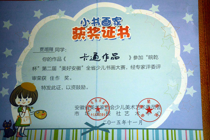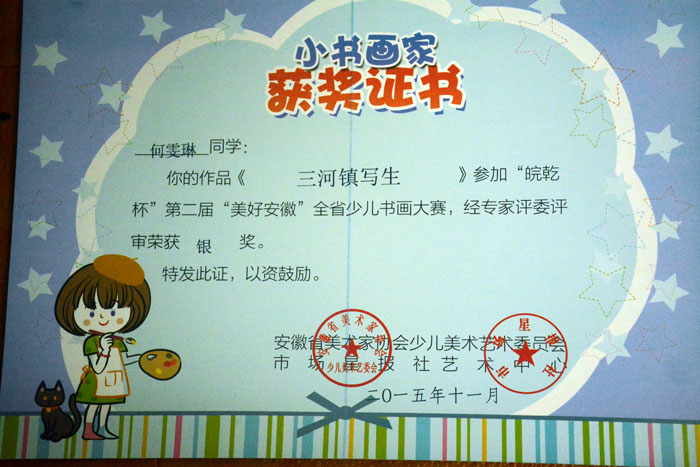 金秋送爽,我省市場(chǎng)星報與美協(xié)聯(lián)合舉辦“皖乾杯”第二屆“美好安徽”全省書(shū)畫(huà)大賽也落下了帷幕。經(jīng)過(guò)層層選拔后,我校有六名學(xué)員參加并在比賽中獲得了喜人的成績(jì)!我校有現合肥六中何雯琳同學(xué)獲得銀獎,現樂(lè )農小學(xué)奧林校區鄭舒文同學(xué)獲得銅獎,六安路小學(xué)的趙昕成、安三小的賈翊翔同學(xué)獲得佳作獎。為以上同學(xué)獲得的成績(jì)給予表彰獎勵!并希望在這次大賽中獲獎的同學(xué)要戒驕戒躁、再接再厲,力爭取得更大的成績(jì)!